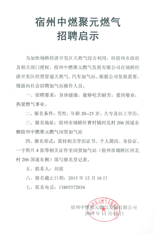 宿州中燃聚元公司招聘启示